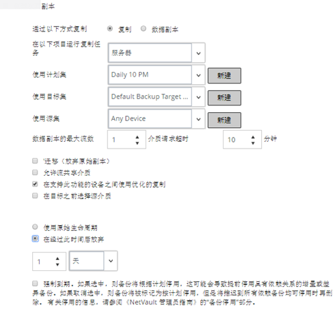 如果主要副本已加密,则无论您是否勾选仅加密次要副本复选框,数据复制方法都会自动创建加密保存集。因此,此选项只在您希望创建未加密主要副本的加密次要副本时有用。
