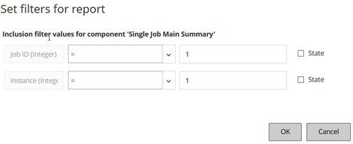 Wenn Sie einen vordefinierten Bericht ausführen, der Filterbedingungen umfasst, wird das Dialogfenster Filter für Bericht festlegen angezeigt. Sie können Bedingungen festlegen, auf deren Basis das Berichtssystem die Ausgabe erstellt. Für jedes Filterfeld, das Sie verwenden möchten, müssen Sie den Filteroperator auswählen und den Vergleichswert angeben. Das folgende Dialogfeld Filter für Bericht festlegen wird beispielsweise für den Bericht „Einzeljobübersicht“ angezeigt.