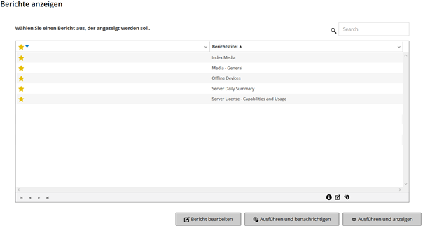 Auf der Seite Berichte anzeigen können Sie einen beliebigen Bericht bzw. Berichte auswählen, um ihn bzw. sie als Favoritenbericht/e zu markieren, damit Sie diese/n einfach aus der Liste der vordefinierten Berichte aufrufen können.