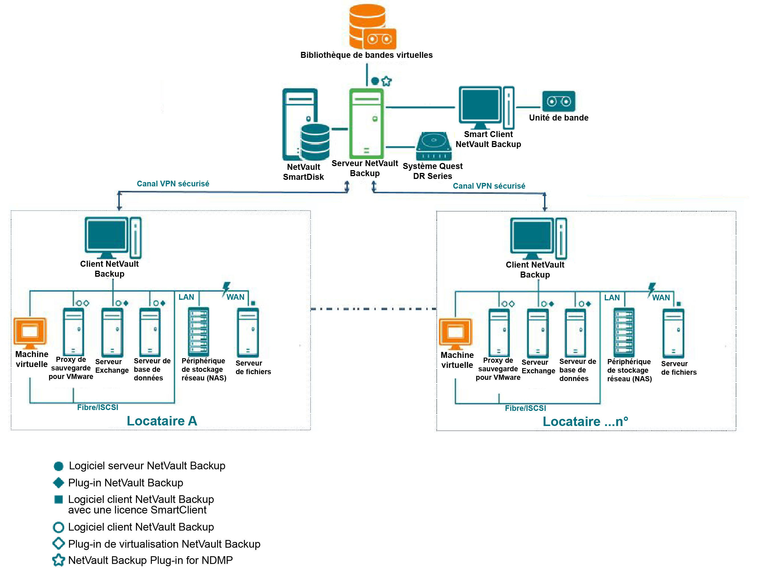 Le diagramme suivant présente un déploiement NetVault Backup.