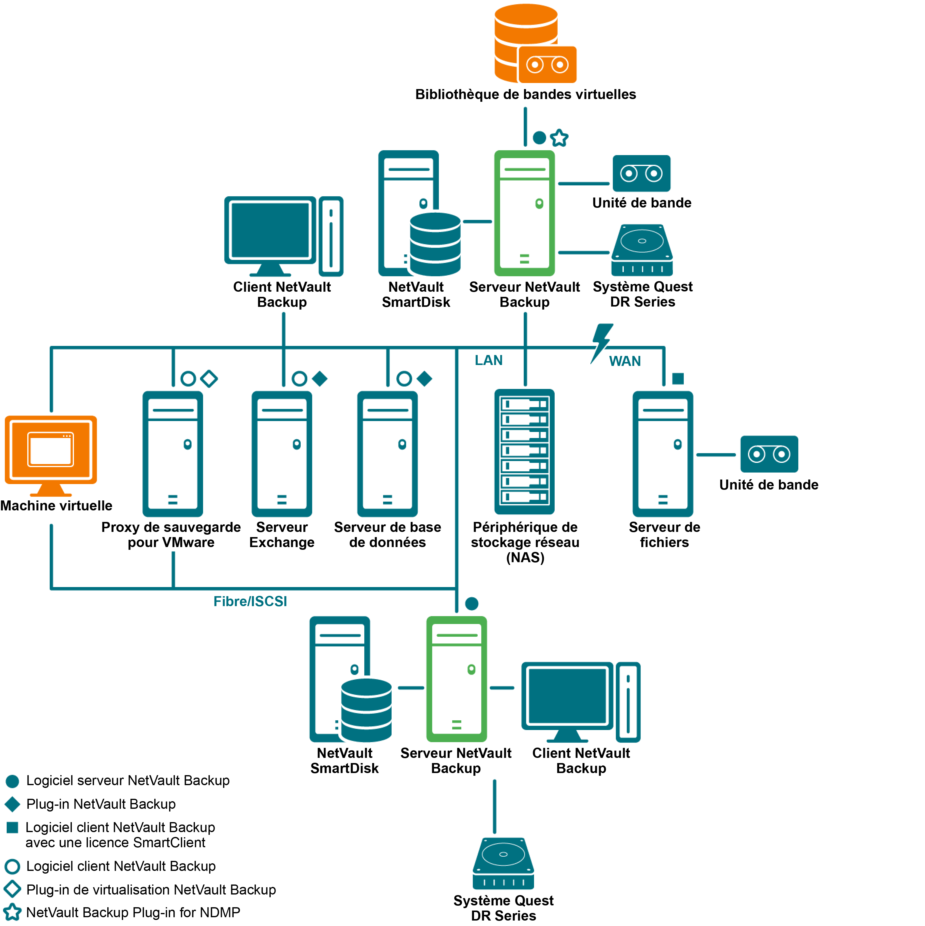 Le diagramme suivant présente un déploiement NetVault Backup.