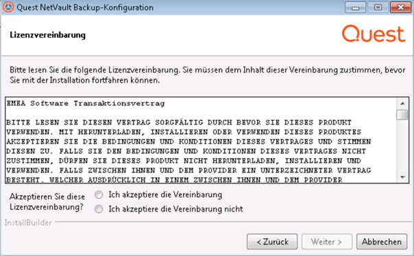 Klicken Sie im Dialogfeld Lizenzvereinbarung auf Ich akzeptiere die Vereinbarung, wenn Sie alle Bedingungen akzeptieren.