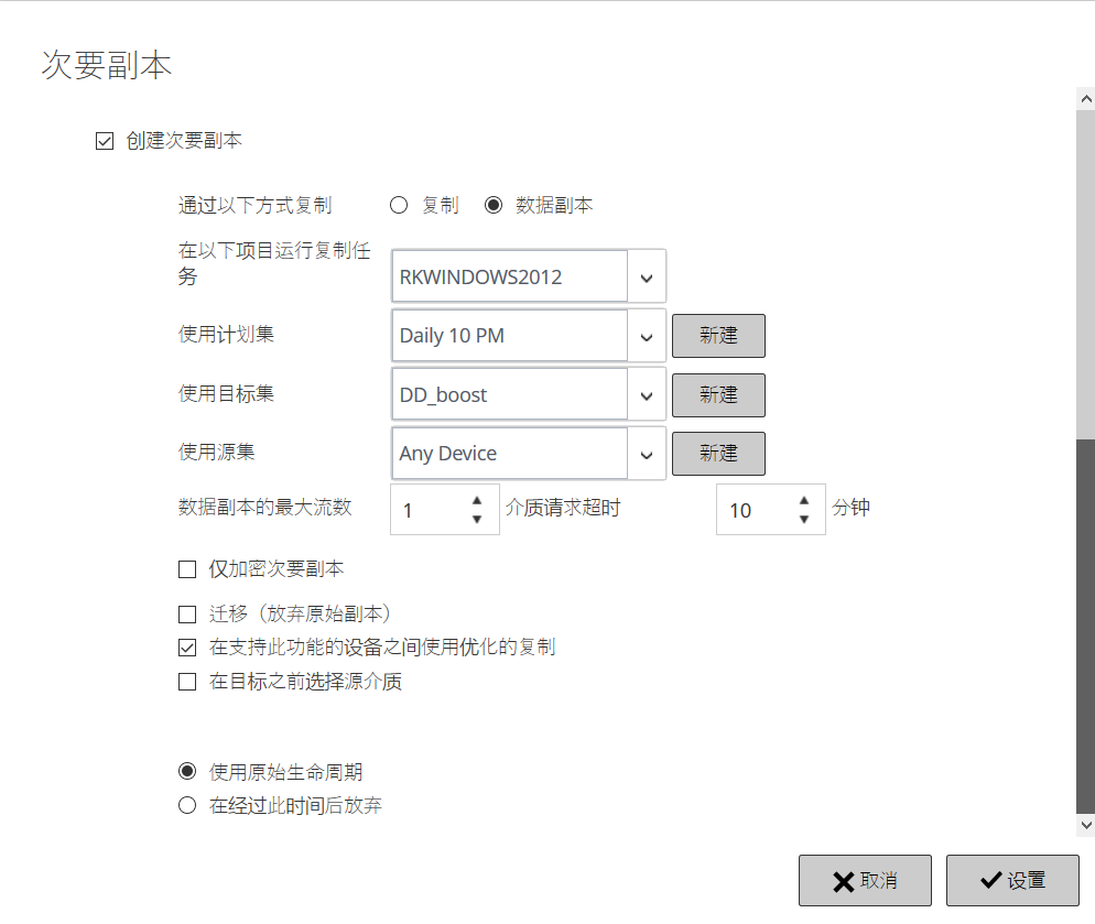 如果主要副本已加密,则无论您是否勾选仅加密次要副本复选框,数据复制方法都会自动创建加密保存集。因此,此选项只在您希望创建未加密主要副本的加密次要副本时有用。