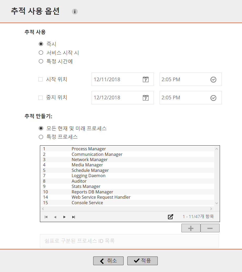 모든 현재 및 미래 프로세스: 이 옵션은 기본적으로 선택됩니다. 모든 현재 및 신규 프로세스에 추적 파일을 생성하려면 이 옵션을 사용합니다.
