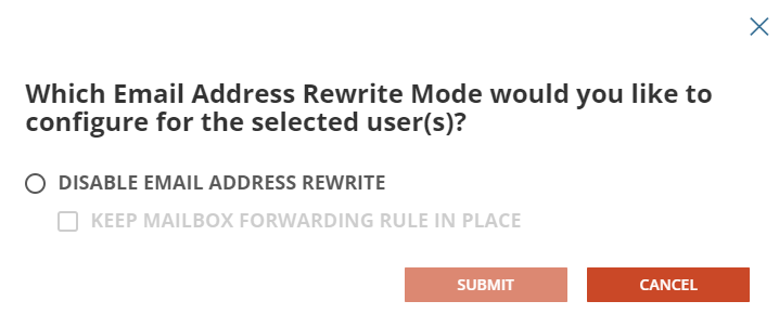 5. Select Disable Email Address Rewrite and ensure the Keep Mailbox Fowarding Rule In Place option is un-selected.  Click on Submit.