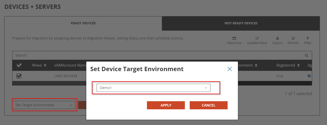 4. Step 1: Define the target environment for the device in the Ready Devices tab.