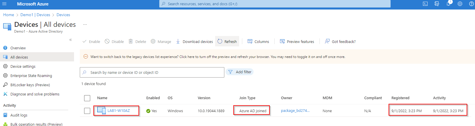1. Log into target Microsoft Entra ID Admin Center, via the Device view and verify the device is Microsoft Entra ID Joined.