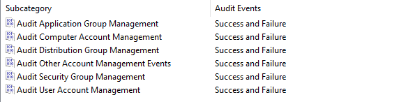 To enable advance audit policy for Account Management, go to gpedit.msc > Computer Configuration > Policies > Windows Settings > Security Settings > Advanced Audit Policy Configuration > System Audit Policies > Account Management enable Success and Failure audit for the below policies.