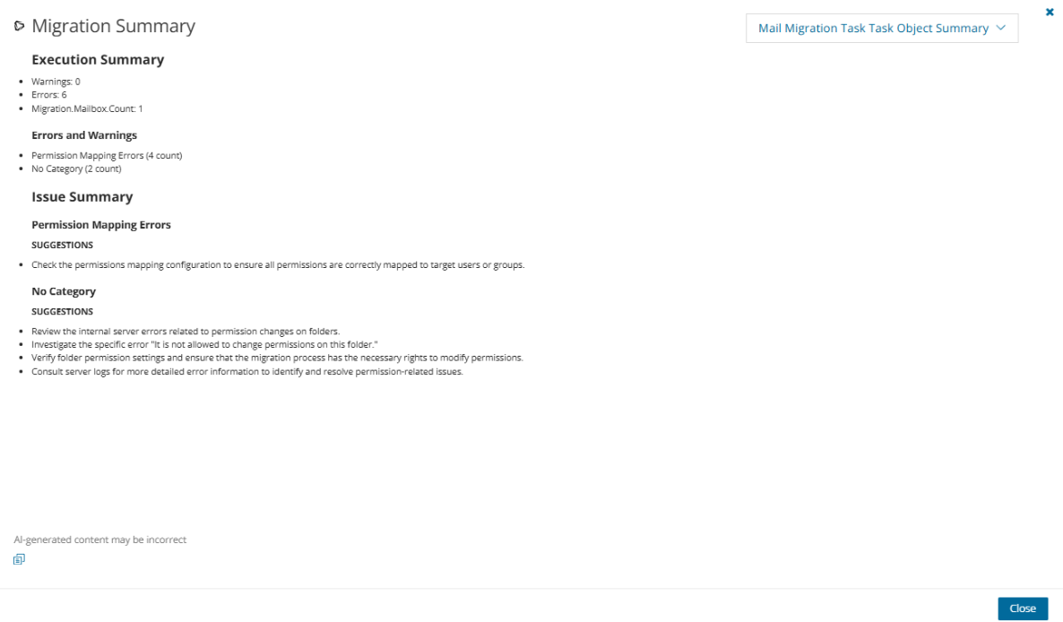 - View AI Summary - This link is available if you opted for the AI feature in the organization you created (see Organizations and Regions), and the task is a migration task that supports the AI migration assistant and you selected the Generate AI summaries option in the Reporting step of the migration wizard. Click this link after the task has completed, to view the AI-generated migration summary.