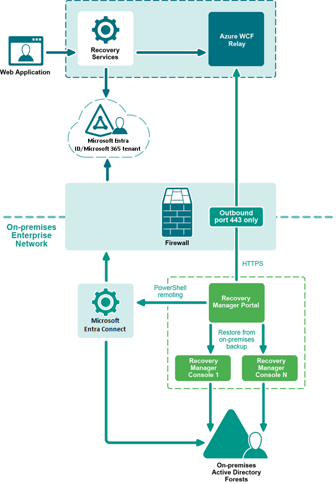 Hybrid configuration with Recovery Manager for Active Directory requires only outbound TCP/UDP port 443 to be opened on the Recovery Manager Portal server to access the internet. If the Recovery Manager Portal server already has access to the internet, you do not need to change the Firewall configuration.