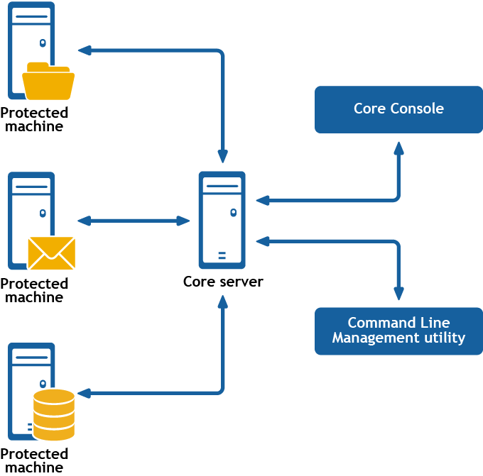 • The Rapid Recovery Core manages authentication for protected machines, schedules for transferring data for backup and replication, export to virtual machines, reporting, and bare metal restore (BMR) to similar or dissimilar hardware.