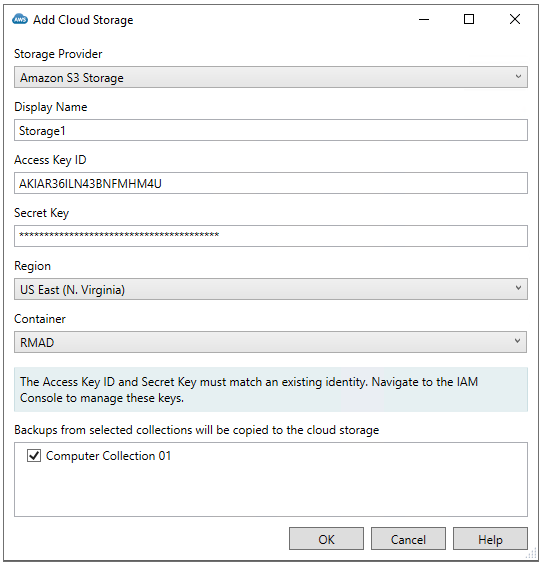 Note: An AWS Identity and Access Management (IAM) user account will be needed in advance to create and finalize the AWS bucket location. See IAM Access Keys for more information.