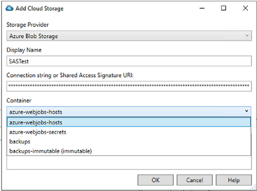 8. Select the Container. The available containers in the Azure® Cloud Storage will be displayed in the drop down list for the connected storage account. Containers protected with an immutability policy will be displayed with (immutable) after the container name.