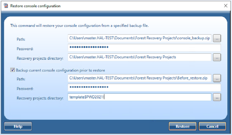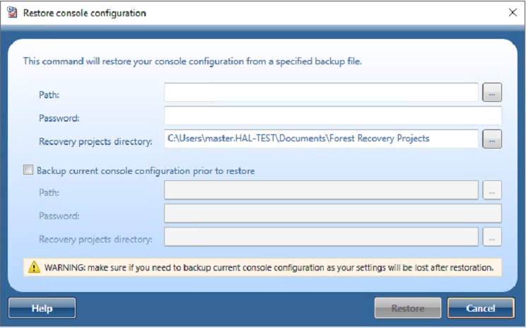 With Forest Recovery Console Configuration Backup and Restore you can backup your Forest Recovery Console settings and project files.