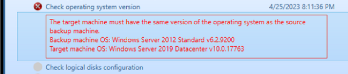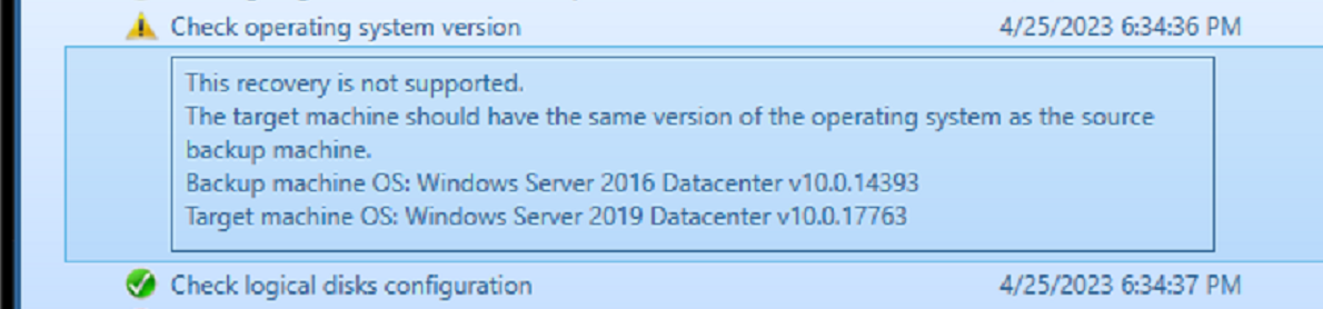 When both systems are 2016/2019/2022 but they do not match, a warning is presented. While it is possible that the operation will work, it is recommended that it should not be performed.