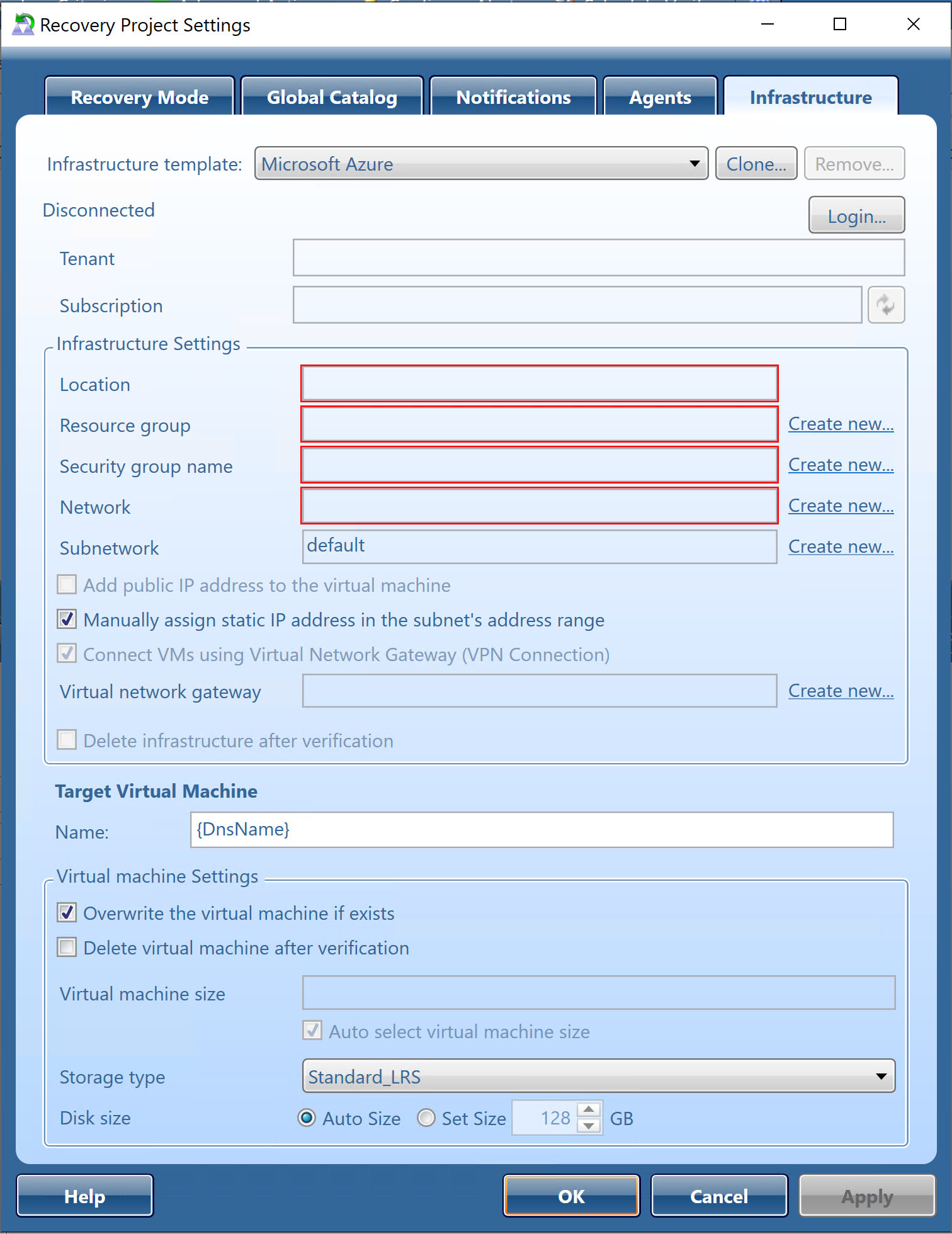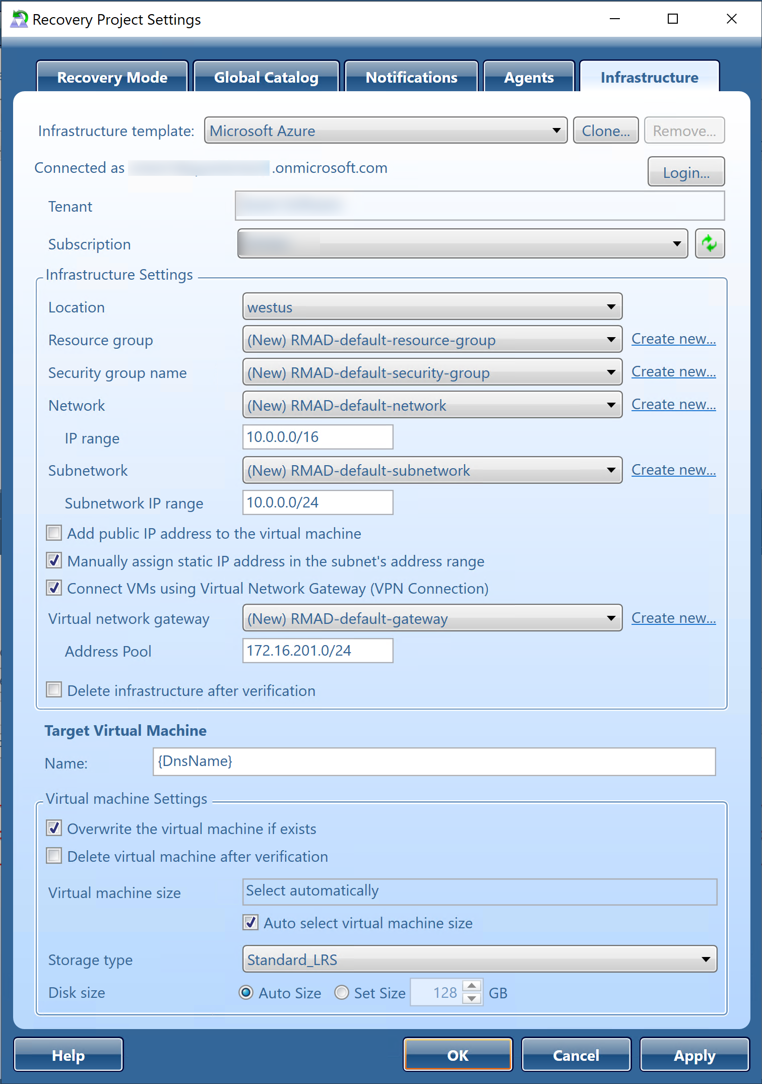 IMPORTANT: The Virtual Network Gateway(VPN connection) will take approximately 30 minutes to be created. If Connect VMs using Virtual Network Gateway (VPN Connection) and Delete Infrastructure after verification are both selected, the Virtual Network Gateway will be deleted as part of the infrastructure. Since the Virtual Network Gateway will need to be created again during the restore operation, the length of time required for the recovery will be increased by 30 minutes.