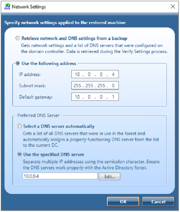 Retrieve network and DNS settings from a backup - (used by default) This option gets network settings for the selected domain controller from the backup