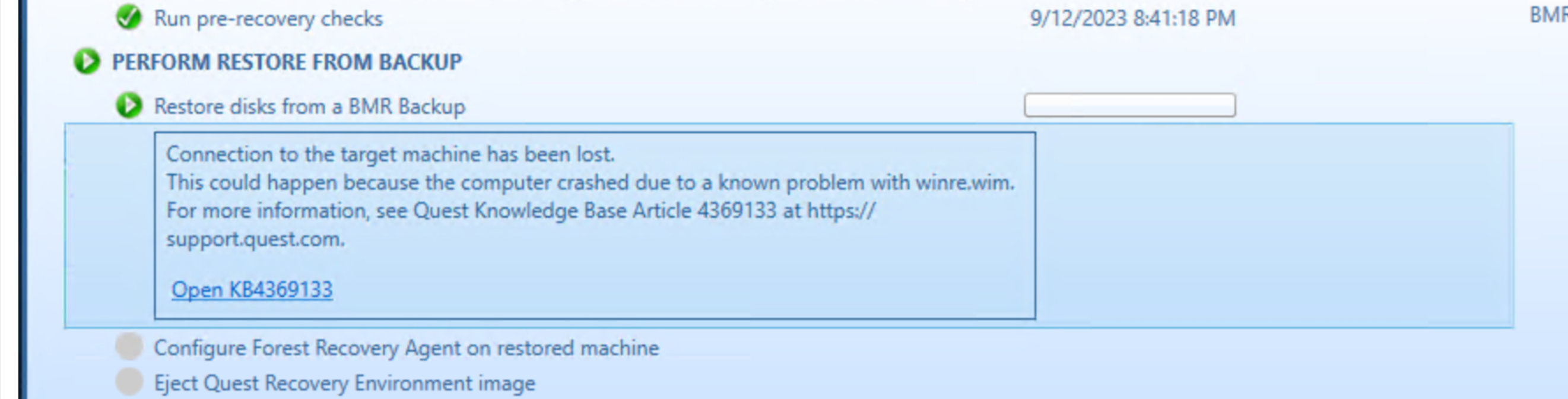 During, Perform restore from backup, if the RMAD console loses connection to the Forest Recovery Agent on the domain controller during the BMR recovery, a message will be presented and inform you to access Quest Knowledge Base article 4369133 and provides a link for more info.