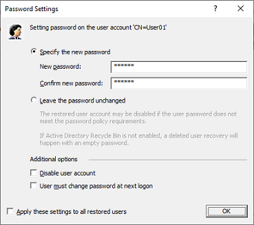 • Leave the password unchanged. Select this option if you want to leave the user password unchanged. When you select this option, the restored user account can be disabled if its password does not meet the password policy requirements.