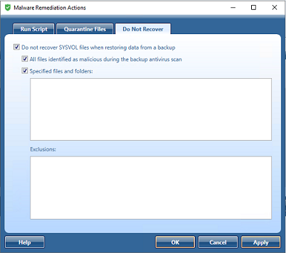 You can use this tab to make choices for scanning of malware or server maintenance during recovery. RMAD does not scan and remediate with this feature. The feature pauses the recovery during Directory Services Restore mode (DSRM) before the domain controller is restarted into normal mode allowing users to perform maintenance and run their own scans using third party tools and/or remediate if malware found.