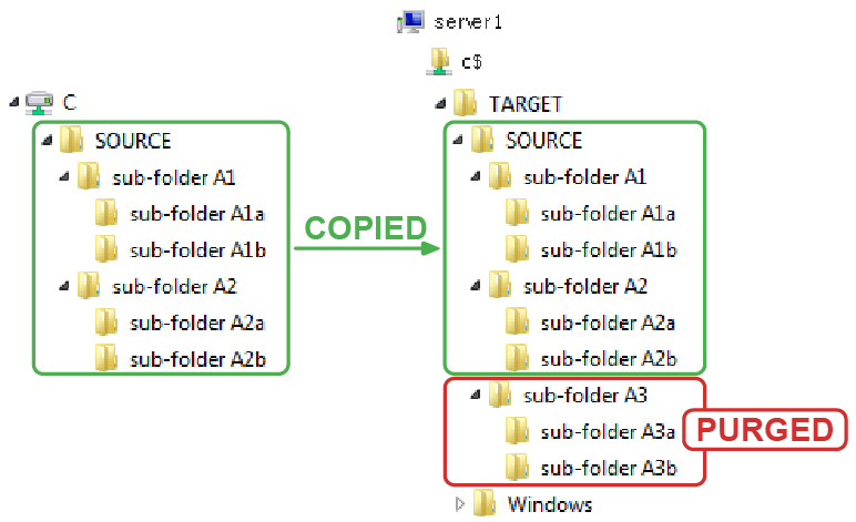 Because the Create initial source folder under target folder check box is not selected, the source parent folder is not duplicated under the target path, but the source subfolders are duplicated. When the copy process is complete: