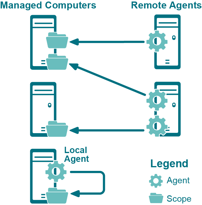 A managed computer may be scanned by either a local agent or one or more remote agents. Only one local agent can be installed on a managed computer and a managed computer with a local agent cannot be scanned by remote agents.