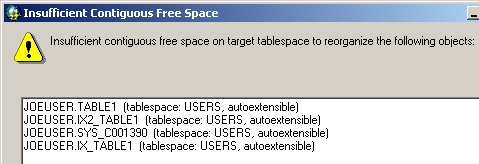 | Insufficient Contiguous Free Space | When one or more target tablespaces do not have enough contiguous free space for more objects, a message with a list of these tablespaces and objects displays when you proceed to the Review Space Usage window.