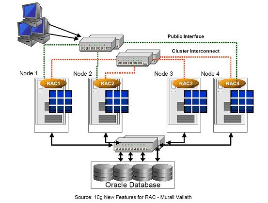 Real Application Clusters (RAC) is a clustering technology. Oracle RAC is a “shared disk” clustering solution that is significantly different from the architectures offered by Microsoft SQL Server and IBM DB2. Each node in an Oracle RAC cluster has equal access to all of the database data through a shared disk subsystem. Data is neither partitioned to specific nodes, nor replicated across nodes. A high-speed network interconnect allows each node to keep its in-memory view of data consistent.