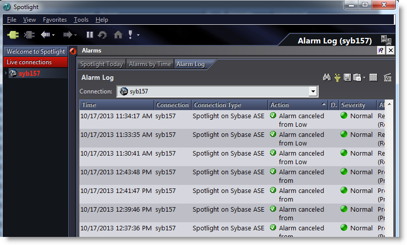 The Alarm Log drilldown provides access to information about alarms that have been raised for the current Spotlight on SAP ASE connection.