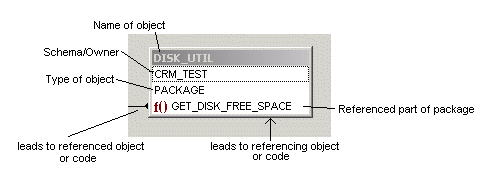Each object listing contains the name of the object, the schema where it resides, and the type of object. For Code Type | Package in Collapse Package view, any sub units that are referenced will be included under the object type. For example: