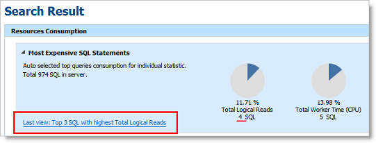 Click a pie chart to open Top SQL, Top Batches, or Top Database Objects and quickly drill down to result details.