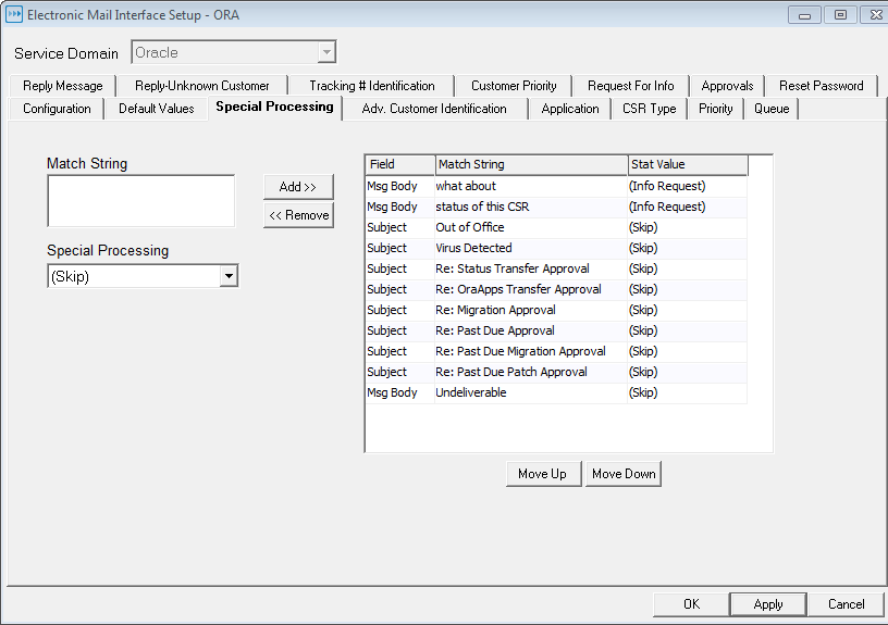 For the Agent to recognize the inbound email as an information request, you must specify a match string in the Special Processing tab that includes part of this special identifier line. The match string should not match the special identifier line completely (which is CSR number and sender specific), but should at least include “<<Stat”, and possibly the service domain as well, for example, “<<Stat|CHG”, where “CHG” is the service domain code.