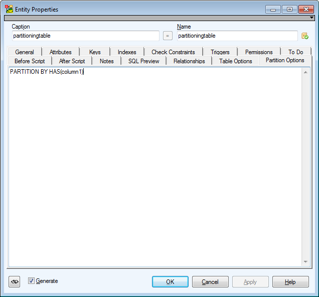 On the Partition Options tab, you can write SQL code to create partition. The partition will be generated in SQL code as well as in reports.