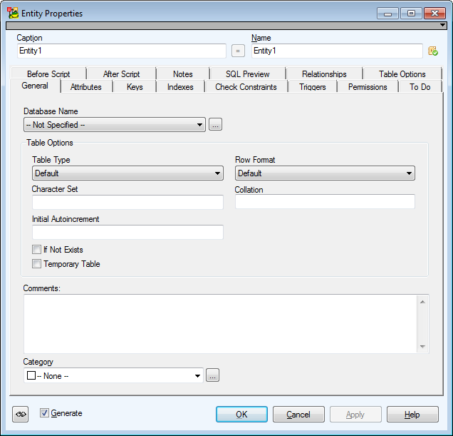 Comments box on tab General - The text written in the Comments box on entities and attributes is generated in final DDL script.