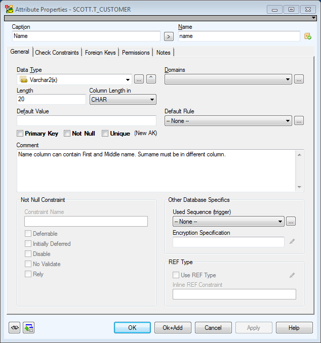 • Current behavior: “Default” item is shown for the attribute. BYTE will be shown in Model Properties dialog | Database Parameters tab | Length Semantics box (it is not used during script generation).