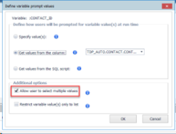 • Allow user to select multiple values – This option controls whether multiple values can be selected for a variable when using the IN/NOT IN operator.