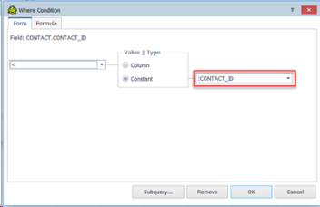 • In the Where, Having, or OR Condition editor, enter the bind variable in place of a constant.