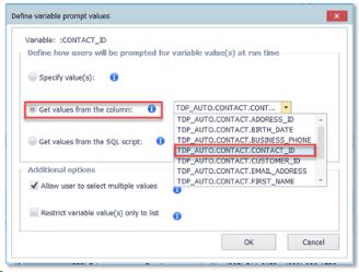 • Restrict variable value(s) only to list – This option enables the user to restrict the variable values to the predefined list which is created in the Define variable prompt values options. That means that the values cannot be entered manually and can only be selected from the predefined list of values.