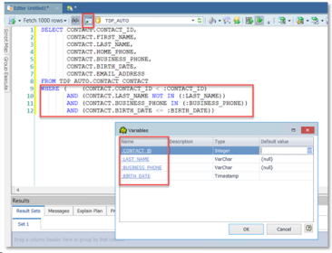 If bind variables are defined in the query, clicking on the Variables button will bring up a new window where all the variables present in the SQL script are listed.
