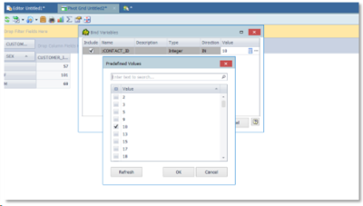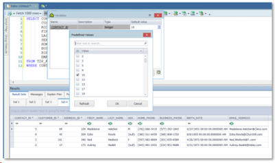 Toad also allows you to specify a default value for the variable before the query is executed by using the Variables option. The default value can be specified by entering the value manually or by using advanced options to configure a list of specific values.