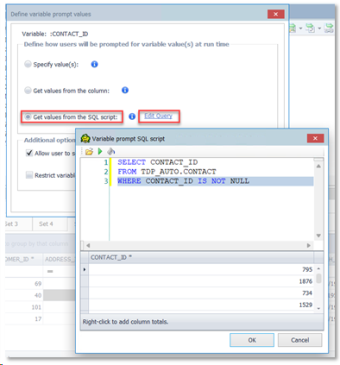 Clicking on the Edit Query link will open a mini editor in the SQL Script Edit window. This option allows the user to specify a SQL query that will return a result set for a single column which will be used to populate the list of predefined variable values. After the query is specified, it needs to be run in the editor in order to populate the predefined values list.