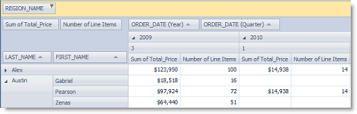 4. Now remove the REGION_NAME field from the Row Area by dragging it back to the field list. Drag the LAST_NAME field to the Row Area. Your pivot now displays total price per customer for each quarter.
