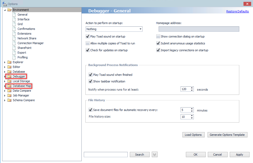Database Map and Debugger folders can be found under Tools/Options: