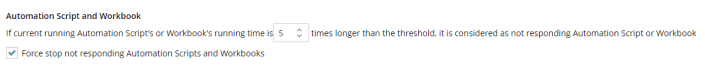 Now, under the Settings tab within the Server settings, an enchantment for managing workbooks that run longer than the specified threshold is added among automation scripts. This option automatically intervenes when a workbook exceeds its expected processing time, ensuring optimal performance and efficiency. This behavior will be applied to all published automation scripts and workbooks that have at least one successful run.