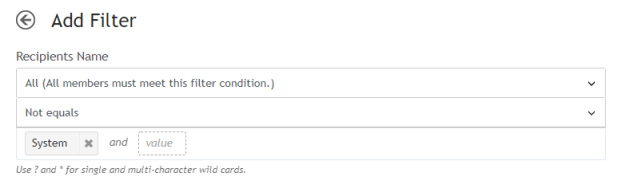 If you set a filter for Recipients | Name Not Equals System, you can specify if the filters should include results where at least one recipient or all the recipients must meet the filter criteria. If you select All, only the results where all the recipients meet the filter criteria are included in the insight.