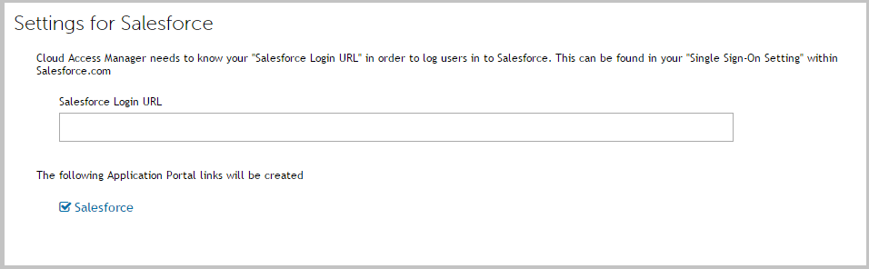 The template settings page is the first page of the application setup wizard that you will see when you click on a template. The image below shows an example of the Salesforce template settings page within Cloud Access Manager.
