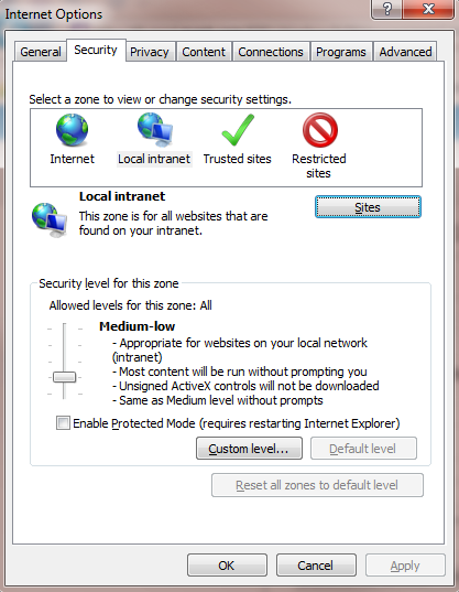 NOTE: If you are using the Cloud Access Manager Login Form Inspection Tool in Internet Explorer, your Cloud Access Manager website will need to be in the Local intranet zone. This can be selected by going to the Internet Options | Security tab in Internet Explorer while viewing your site. If Local Intranet is not highlighted as shown, click Local intranet |Sites | Advanced then add your Cloud Access Manager site.