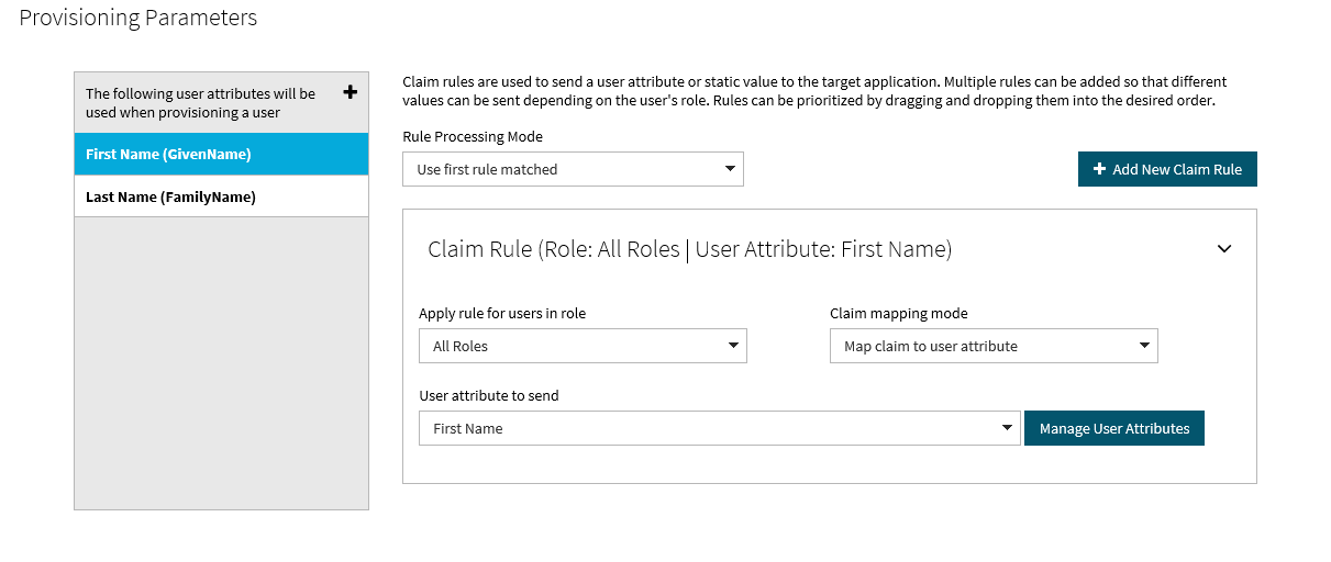 13. In order to provision a user, the application will typically require a number of provisioning parameters to be defined. For example, Google Apps requires the user’s first and last name. For each parameter, configure a claim rule to map the provisioning parameter to a user attribute containing the required value. For example, add a claim called Last Name, where its value is derived from the Active Directory user attribute sn.