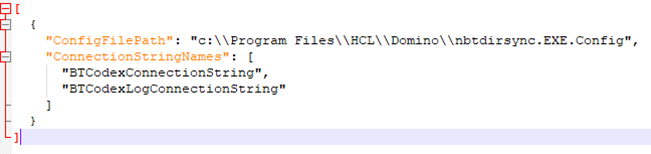 The SQL Server Change Password Utility can be used to change the Directory Sync Pro connection strings, in the Domino and Windows server configuration files, used to access the SQL server. The utility is configured by editing the ChangeSQLServerPW.json file.