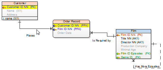 The Order Record entity cannot exist itself. It is dependent on entities Customer and Film. Therefore the Identifying relationship is used. The Order Record entity is a dependent entity, and the Customer ID and Movie ID items are its unique record identifiers.